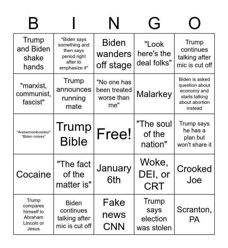 This bingo card has a free space and 24 words: "The fact of the matter is", Biden continues talking after mic is cut off, "No one has been treated worse than me", Trump compares himself to Abraham Lincoln or Jesus, Trump continues talking after mic is cut off, Trump and Biden shake hands, "marxist, communist, fascist", *Biden says something and then says period right after to emphasize it*, "The soul of the nation", January 6th, Malarkey, "Arebemombosidso" *Biden noises*, Woke, DEI, or CRT, Crooked Joe, Trump announces running mate, Trump says election was stolen, Trump says he has a plan but won't share it, Biden wanders off stage, Biden is asked question about economy and starts talking about abortion instead, Trump Bible, Scranton, PA, Cocaine, "Look here's the deal folks" and Fake news CNN.