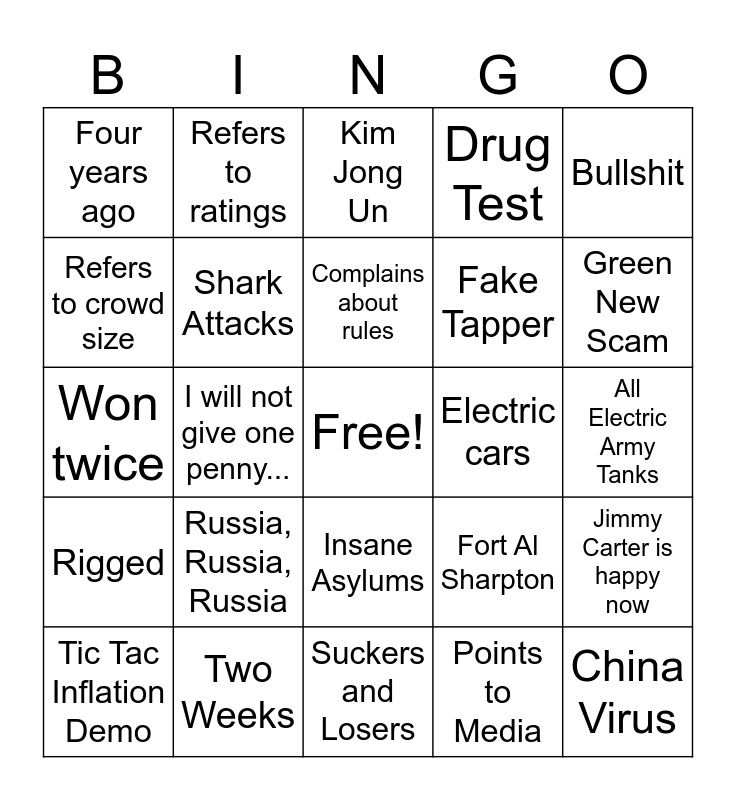 This bingo card has a free space and 25 words: Russia, Russia, Russia, Suckers and Losers, Complains about rules, Tic Tac Inflation Demo, Bullshit, Four years ago, Refers to crowd size, Refers to ratings, Electric cars, Insane Asylums, Fake Tapper, Won twice, Fort Al Sharpton, Jimmy Carter is happy now, Shark Attacks, Venezuelan Crime Rates, All Electric Army Tanks, Kim Jong Un, Green New Scam, I will not give one penny..., China Virus, Two Weeks, Rigged, Drug Test and Points to Media.