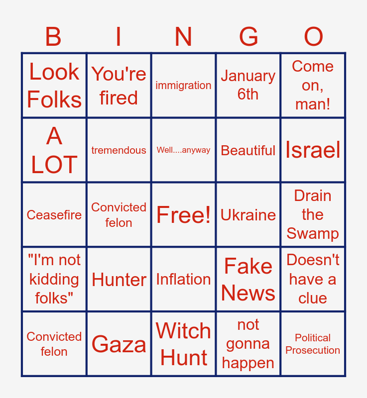 This bingo card has a free space and 33 words: There you go again, I…I…I…um…(exit stage left), Convicted felon, MAGA, "I'm not kidding folks", tremendous, Come on, man!, Convicted felon, You're fired, Not a joke, Well....anyway, immigration, border security, Putin, Ukraine, Israel, Gaza, Ceasefire, Hunter, Fake News, Inflation, Bigly, Look Folks, Drain the Swamp, Witch Hunt, Political Prosecution, January 6th, Beautiful, A LOT, Doesn't have a clue, laughing at us, not gonna happen and Zippo.