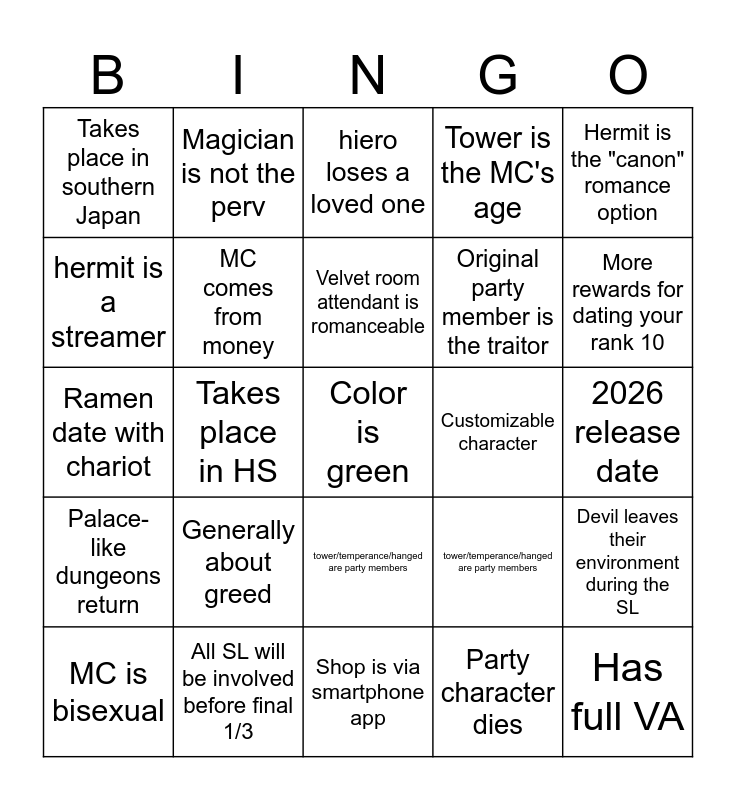 This bingo card has a free space and 27 words: tower/temperance/hanged are party members, Hermit is the "canon" romance option, Original party member is the traitor, Shop is via smartphone app, hermit is a streamer, hiero loses a loved one, Magician is not the perv, Palace-like dungeons return, Customizable character, Devil leaves their environment during the SL, Ramen date with chariot, Tower is the MC's age, MC is bisexual, All SL will be involved before final 1/3, More rewards for dating your rank 10, Music juxtaposition, MC comes from money, Velvet room attendant is romanceable, Generally about greed, Takes place in southern Japan, 2026 release date, Party character dies, Takes place in HS, Has full VA, tower/temperance/hanged are party members, Hermit is the "canon" romance option and Original party member is the traitor.