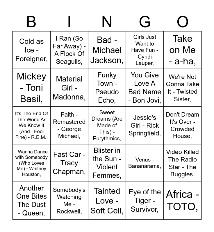 This bingo card has 51 words: Free!, Sweet Dreams (Are Made of This) - Eurythmics,, Kiss - Prince,, Tainted Love - Soft Cell,, Fast Car - Tracy Chapman,, Cars - Gary Numan,, I Ran (So Far Away) - A Flock Of Seagulls,, Heaven Is A Place On Earth - Belinda Carlisle,, Mickey - Toni Basil,, Hit Me With Your Best Shot - Pat Benatar,, Material Girl - Madonna,, Girls Just Want to Have Fun - Cyndi Lauper,, Video Killed The Radio Star - The Buggles,, Venus - Bananarama,, Everybody Wants To Rule The World - Tears For Fears,, Rock And Roll All Nite - KISS,, Funky Town - Pseudo Echo,, Jessie's Girl - Rick Springfield,, Don't Stop Believin' - Journey,, Take on Me - a-ha,, Faith - Remastered - George Michael,, Eye of the Tiger - Survivor,, Cold as Ice - Foreigner,, You Give Love A Bad Name - Bon Jovi,, Jump - Van Halen,, Africa - TOTO,, We're Not Gonna Take It - Twisted Sister,, Let's Dance - David Bowie,, Another One Bites The Dust - Queen,, Bad - Michael Jackson,, Walk Like an Egyptian - The Bangles,, White Wedding - Billy Idol,, Down Under - Men At Work,, Roxanne - The Police,, Whip It - DEVO,, Somebody's Watching Me - Rockwell,, Ghostbusters - Ray Parker Jr.,, Footloose - Kenny Loggins,, Walking On Sunshine - Katrina & The Waves,, Physical - Olivia Newton-John,, Don't Dream It's Over - Crowded House,, I Wanna Dance with Somebody (Who Loves Me) - Whitney Houston,, You Spin Me Round (Like a Record) - Dead Or Alive,, Total Eclipse of the Heart - Bonnie Tyler,, Under the Milky Way - The Church,, Need You Tonight - Single Edit - INXS,, It's The End Of The World As We Know It (And I Feel Fine) - R.E.M.,, Rock the Casbah - The Clash,, The Safety Dance - Men Without Hats,, Blister in the Sun - Violent Femmes, and Turning Japanese - The Vapors,.