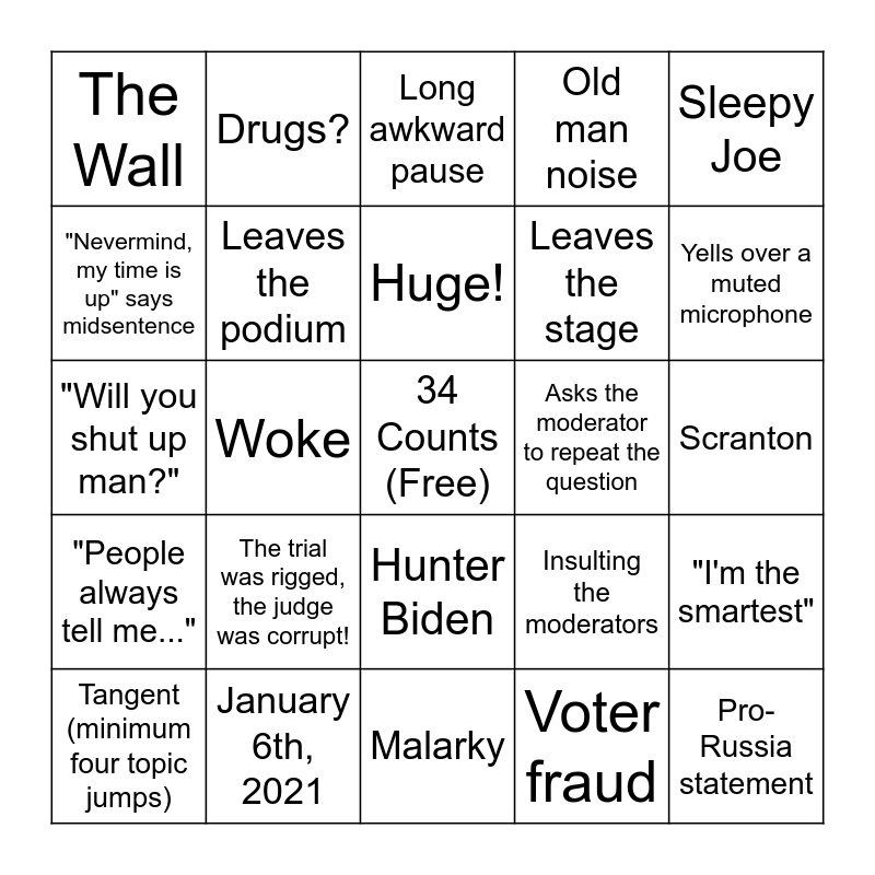 This bingo card has a free space and 24 words: The trial was rigged, the judge was corrupt!, January 6th, 2021, Huge!, Tangent (minimum four topic jumps), Sleepy Joe, The Wall, "Nevermind, my time is up" says midsentence, Drugs?, Asks the moderator to repeat the question, Hunter Biden, Leaves the stage, "Will you shut up man?", Insulting the moderators, "I'm the smartest", Leaves the podium, Voter fraud, Scranton, Long awkward pause, Yells over a muted microphone, Woke, Pro-Russia statement, "People always tell me...", Old man noise and Malarky.