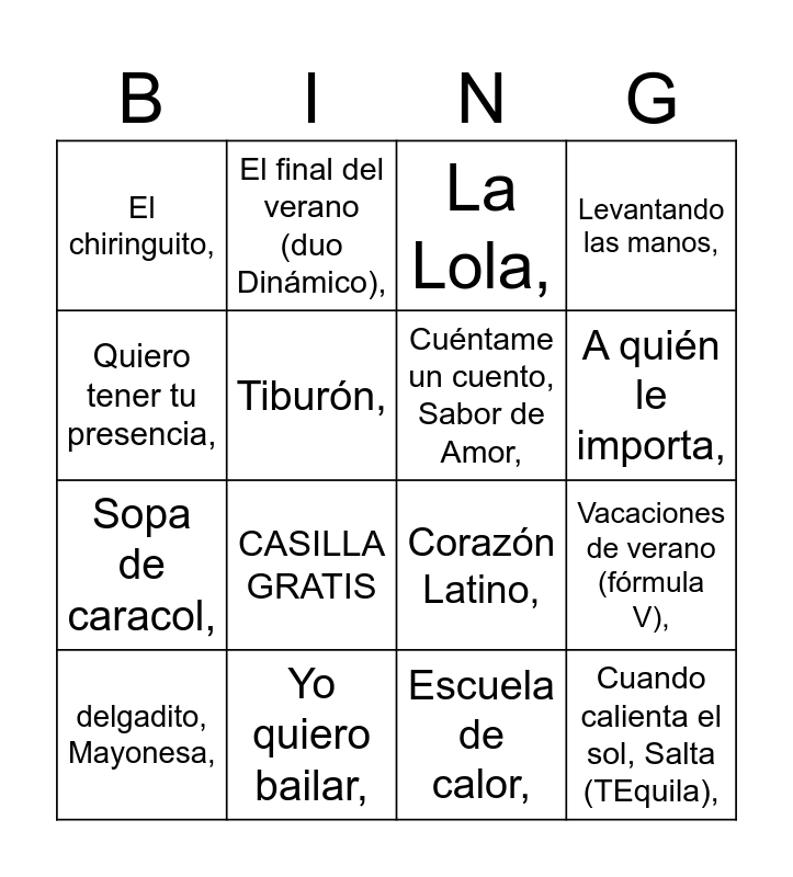 This bingo card has 32 words: Free!, Free!,, Vacaciones de verano (fórmula V),, Si yo tuviera una escoba, Aquí no hay playa (Los refrescos),, Cuando calienta el sol, Salta (TEquila),, Cuéntame un cuento, Sabor de Amor,, Quiero tener tu presencia,, Adiós Papá,, El final del verano (duo Dinámico),, La madre de José,, A quién le importa,, La Lola,, Desátame,, No me importa nada,, Yo quiero bailar,, Antes muerta que sencilla,, Cuando tú vas,, Corazón Latino,, Cuando zarpa el amor,, Amigos para siempre,, Sarandonga,, Se acabó,, Escuela de calor,, Cuidado con Paloma,, delgadito, Mayonesa,, Levantando las manos,, Sopa de caracol,, Tiburón,, El chiringuito,, La barbacoa, Fría and CASILLA GRATIS.