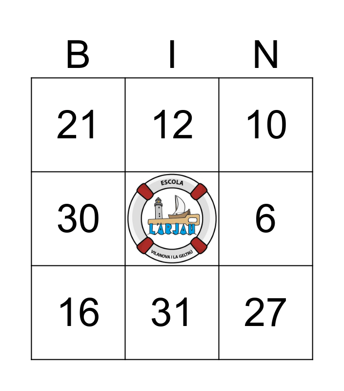 This bingo card has a free space and 8 words: 6, 10, 12, 16, 21, 27, 30 and 31.