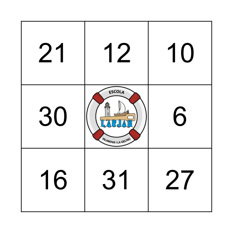 This bingo card has a free space and 8 words: 6, 10, 12, 16, 21, 27, 30 and 31.