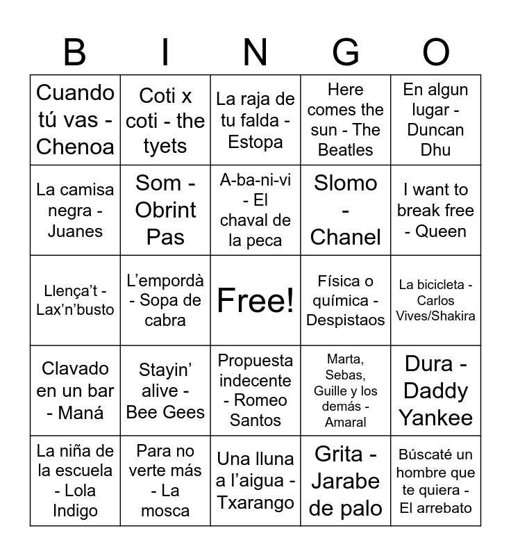 This bingo card has a free space and 103 words: Ciega sordomuda - Shakira, Thunderstruck - ACDC, En algun lugar - Duncan Dhu, Como hemos cambiado - Presuntos implicados, 19 días y 500 noches - Joaquin Sabina, Me colé en una fiesta- Mecano, 20 de abril - Celtas cortos, Aquí no hay playa - The refrescos, Salta - Tequila, Mambo n5 - Lou Bega, Veneno en la piel - Radio Futura, La bilirrubina - Juan Luis Guerra, Oye com va - Santana, Mi gran noche - Raphael, Vivir así es morir de amor - Camilo Sesto, Waterloo - Abba, La raja de tu falda - Estopa, A quién le importa - Alaska i Dinarama, Conga - Gloria Estefan, Let’s get loud - Jennifer Lopez, Man! I feel like a woman! - Shaina Twain, Girls just want to have fun - Cindy Lauper, Like a prayer - Madonna, Take on me - A-ha, Eye of the tiger - Survivor, Stayin’ alive - Bee Gees, I want to break free - Queen, Here comes the sun - The Beatles, La chica de ayer - Nacha pop, La reina del pop - La oreja de Van Gogh, Marta, Sebas, Guille y los demás - Amaral, Grita - Jarabe de palo, Princesas - Pereza, Zapatillas - El canto del loco, Por la boca vive el pez- Fito & fitipaldis, Chiquilla - Seguridad social, La revolución sexual - La casa azul, Libre - Nino bravo, A-ba-ni-vi - El chaval de la peca, Para no verte más - La mosca, Laura no está - Nek, Clavado en un bar - Maná, Sufre mamón - Hombres G, La camisa negra - Juanes, Torero - Chayane, Cuando tú vas - Chenoa, Cuando zarpa el amor - Camela, Búscaté un hombre que te quiera - El arrebato, Sarandonga - Lolita Flores, Amigos para siempre - Los manolos, Que la detengan - David Civera, Yo quiero bailar - Sonia y Selena, Mayonesa - Chocoate, Bomba - King Africa, Ai se eu ti pego - Michael Telo, Amargura - Karol G, La Bachata - Manuel Turizo, Darte un beso - Prince Royce, Obsesión - Aventura, Propuesta indecente - Romeo Santos, La bicicleta - Carlos Vives/Shakira, Titi me preguntó - Bad bunny, Felices los 4 - Maluma, Tacones rojos - Sebastián yatra, Libertad - Nil Moliner, Vida de rico - Camilo, A un paso de la luna - Ana Mena/Rocco Hunt, Coti x coti - the tyets, Llença’t - Lax’n’busto, L’empordà - Sopa de cabra, Una lluna a l’aigua - Txarango, Color esperanza- Diego Torres, Llovera y yo veré - La Pegatina, Todos los días sale el sol - Bongo Botrako, La gozadera - Gente de zona, Despacito - Luis Fonsi, Teléfono - Aitana, La niña de la escuela - Lola Indigo, Volcans - Buhos, In the night - Oques grasses, Caminem lluny - Doctos Prats, Legalización -Ska-p, Som - Obrint Pas, Mi estrella blanca - Fondo flamenco, Física o química - Despistaos, Caminando por la vida - Melendi, Pan y mantequilla - Efecto Pasillo, Vull estar amb tu - Els catarres, Pa amb oli i sal - Blaumut, Benvolgut - Manel, Bailando por ahí - Juan Magán, Pobre diabla - Don Omar, Dura - Daddy Yankee, Ave Maria- David Bisbal, Flying free- Pont Aeri, Nochentera - Vicco, Slomo - Chanel, Caramelo - Ozuna, Son de amores - Andy y Lucas, Colgando en tus manos - Carlos Baute/Marta Sanchez, It’s my life - Bon Jovi, Lobo hombre en París - La Unión and Despechá - Rosalía.