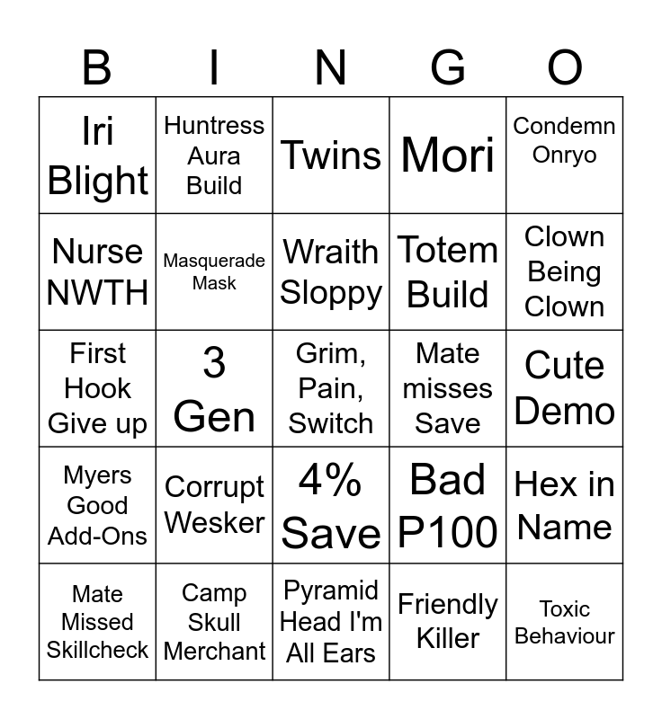 This bingo card has a free space and 24 words: Corrupt Wesker, Camp Skull Merchant, Wraith Sloppy, Mate Missed Skillcheck, Condemn Onryo, Iri Blight, Nurse NWTH, Huntress Aura Build, Mate misses Save, 4% Save, Totem Build, First Hook Give up, Bad P100, Hex in Name, Masquerade Mask, Friendly Killer, Cute Demo, Twins, Clown Being Clown, 3 Gen, Toxic Behaviour, Myers Good Add-Ons, Mori and Pyramid Head I'm All Ears.