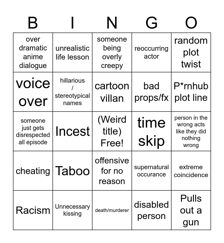 This bingo card has a free space and 24 words: Taboo, Unnecessary kissing, cartoon villan, Racism, random plot twist, over dramatic anime dialogue, voice over, unrealistic life lesson, time skip, offensive for no reason, bad props/fx, someone just gets disrespected all episode, supernatural occurance, extreme coincidence, hillarious / stereotypical names, disabled person, person in the wrong acts like they did nothing wrong, someone being overly creepy, P*rnhub plot line, Incest, Pulls out a gun, cheating, reoccurring actor and death/murderer.