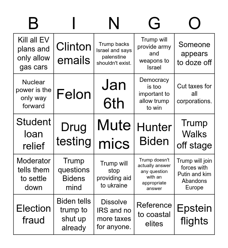 This bingo card has a free space and 24 words: Trump questions Bidens mind, Biden tells trump to shut up already, Jan 6th, Election fraud, Someone appears to doze off, Kill all EV plans and only allow gas cars, Nuclear power is the only way forward, Clinton emails, Hunter Biden, Trump will stop providing aid to ukraine, Democracy is too important to allow trump to win, Student loan relief, Trump doesn't actually answer any question with an appropriate answer, Trump will join forces with Putin and kim Abandons Europe, Felon, Reference to coastal elites, Trump Walks off stage, Trump backs Israel and says palenstine shouldn't exist., Cut taxes for all corporations., Drug testing, Epstein flights, Moderator tells them to settle down, Trump will provide army and weapons to Israel and Dissolve IRS and no more taxes for anyone..