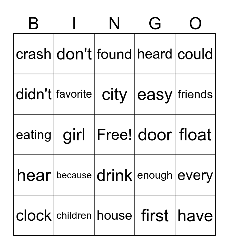 This bingo card has a free space and 24 words: because, children, city, clock, could, crash, didn't, don't, door, drink, easy, eating, enough, every, favorite, first, float, found, friends, girl, have, hear, heard and house.