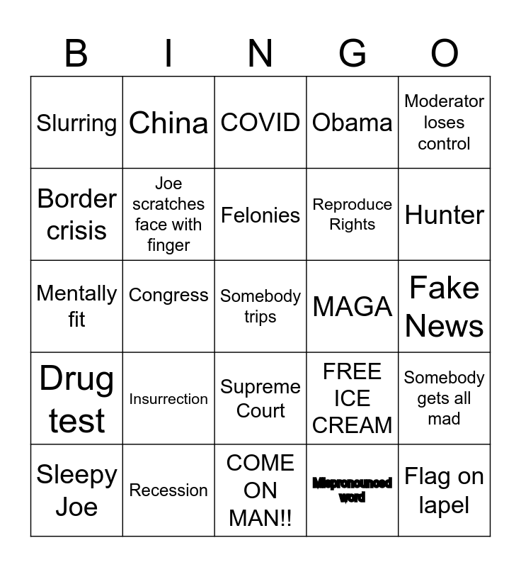 This bingo card has 25 words: Insurrection, COME ON MAN!!, Felonies, Sleepy Joe, Moderator loses control, Slurring, Border crisis, China, MAGA, Supreme Court, Reproduce Rights, Mentally fit, FREE ICE CREAM, Somebody gets all mad, Joe scratches face with finger, Flag on lapel, Fake News, COVID, Hunter, Congress, Somebody trips, Recession, Drug test, Obama and Mispronounced word.