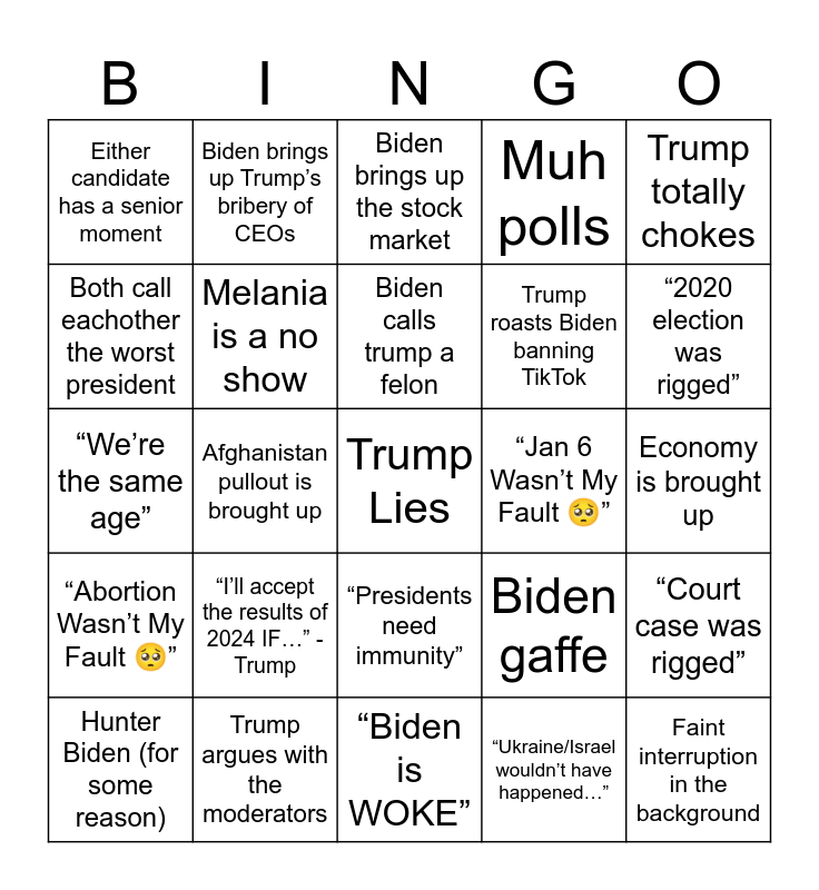 This bingo card has a free space and 24 words: “I’ll accept the results of 2024 IF…” -Trump, Trump argues with the moderators, Biden calls trump a felon, Hunter Biden (for some reason), Trump totally chokes, Either candidate has a senior moment, Both call eachother the worst president, Biden brings up Trump’s bribery of CEOs, “Jan 6 Wasn’t My Fault 🥺”, “Presidents need immunity”, Trump roasts Biden banning TikTok, “We’re the same age”, Biden gaffe, “Court case was rigged”, Melania is a no show, “Ukraine/Israel wouldn’t have happened…”, Economy is brought up, Biden brings up the stock market, “2020 election was rigged”, Afghanistan pullout is brought up, Faint interruption in the background, “Abortion Wasn’t My Fault 🥺”, Muh polls and “Biden is WOKE”.