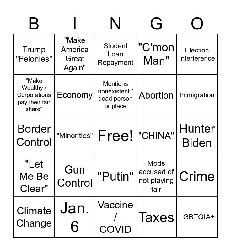 This bingo card has a free space and 24 words: Gun Control, Jan. 6, Mentions nonexistent / dead person or place, Climate Change, Election Interference, Trump "Felonies", "Make Wealthy / Corporations pay their fair share", "Make America Great Again", "CHINA", "Putin", Abortion, Border Control, Mods accused of not playing fair, Crime, Economy, Taxes, Hunter Biden, Student Loan Repayment, Immigration, "Minorities", LGBTQIA+, "Let Me Be Clear", "C'mon Man" and Vaccine / COVID.