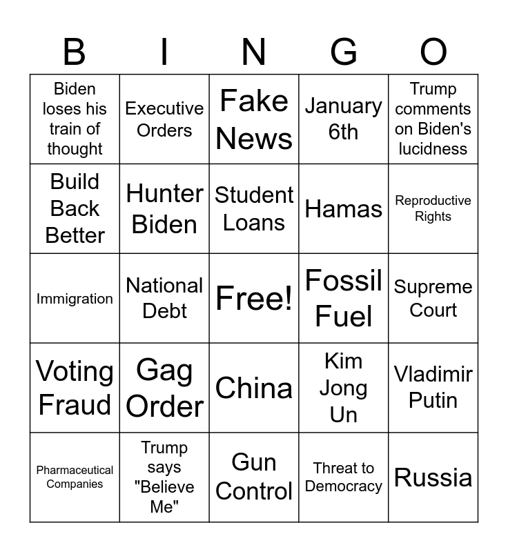 This bingo card has a free space and 35 words: Israel, Borders, AI, Hunter Biden, China, January 6th, Build Back Better, Inflation, Student Loans, Ukraine, Immigration, Trump comments on Biden's lucidness, Impeachment, Convicted Felon, Biden loses his train of thought, Fossil Fuel, Threat to Democracy, National Debt, Voting Fraud, Russia, Kim Jong Un, Pharmaceutical Companies, Vladimir Putin, Trump says "Believe Me", Fake News, Reproductive Rights, Fundamentally Transform America, Trump says Biden's America is a "laughing stock", Hamas, Supreme Court, Affordable Housing, Gun Control, Gag Order, Executive Orders and Threat to Democracy.
