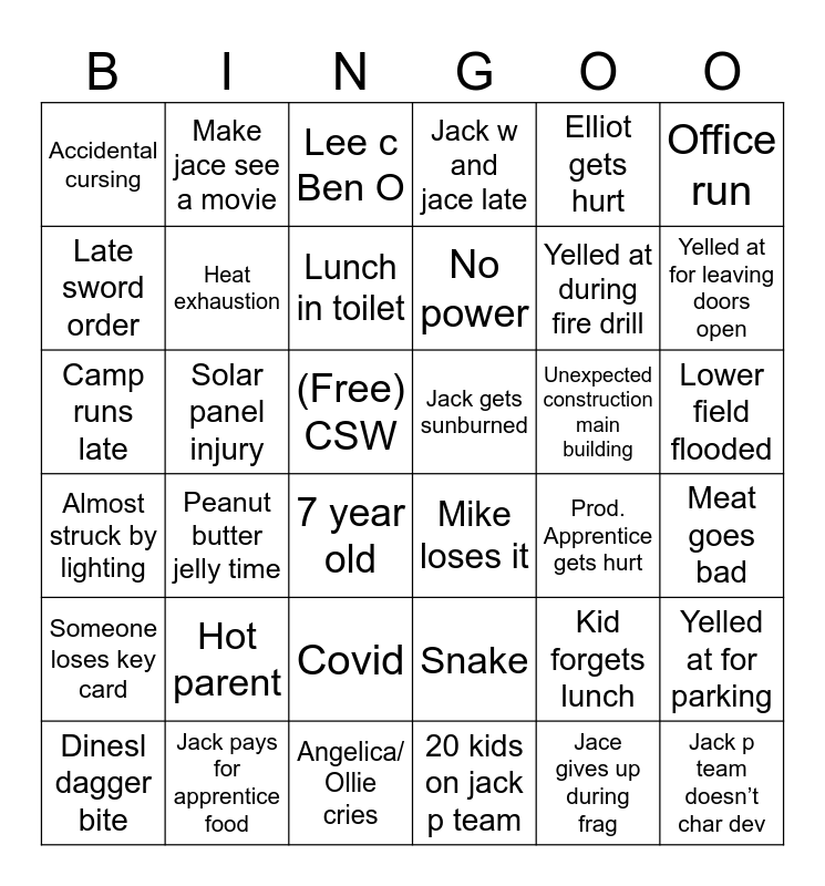 This bingo card has 36 words: Snake, Covid, 20 kids on jack p team, Late sword order, Almost struck by lighting, Jack gets sunburned, Heat exhaustion, Angelica/ Ollie cries, Elliot gets hurt, Kid forgets lunch, Yelled at for leaving doors open, Jack w and jace late, Yelled at for parking, Solar panel injury, No power, Accidental cursing, Someone loses key card, Unexpected construction main building, Camp runs late, Lee c Ben O, (Free) CSW, Peanut butter jelly time, Mike loses it, 7 year old, Prod. Apprentice gets hurt, Make jace see a movie, Yelled at during fire drill, Jack pays for apprentice food, Lunch in toilet, Office run, Jack p team doesn’t char dev, Dinesl dagger bite, Meat goes bad, Lower field flooded, Hot parent and Jace gives up during frag.