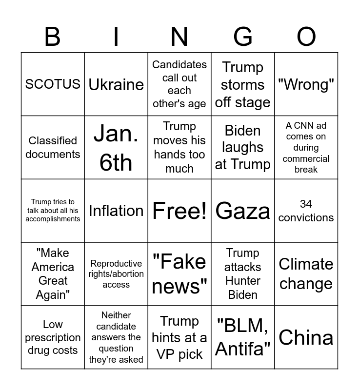 This bingo card has a free space and 34 words: Candidate's mic is muted, "BLM, Antifa", Biden tells a childhood story, Biden does not shake Trump's hand, "Make America Great Again", Jan. 6th, "Wrong", Low prescription drug costs, Ukraine, The economy, Trump moves his hands too much, Candidates call out each other's age, Biden talks about his recent immigration EO, "Our democracy is at stake", Gaza, A CNN ad comes on during commercial break, Neither candidate answers the question they're asked, Trump tries to talk about all his accomplishments, Reproductive rights/abortion access, Trump attacks Hunter Biden, "Fake news", "The border", SCOTUS, 34 convictions, Trump hints at a VP pick, China, Trump storms off stage, COVID-19, Biden laughs at Trump, Classified documents, Student debt relief, Inflation, Climate change and Biden delivers a punch line.