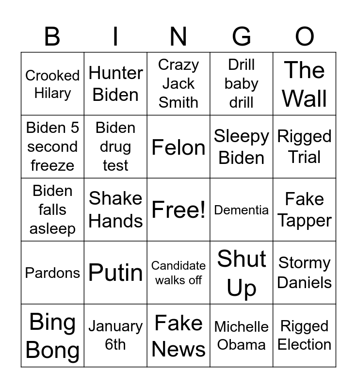 This bingo card has a free space and 24 words: Putin, January 6th, Felon, Bing Bong, The Wall, Crooked Hilary, Biden 5 second freeze, Hunter Biden, Dementia, Candidate walks off, Sleepy Biden, Biden falls asleep, Shut Up, Stormy Daniels, Biden drug test, Michelle Obama, Fake Tapper, Crazy Jack Smith, Rigged Trial, Shake Hands, Rigged Election, Pardons, Drill baby drill and Fake News.