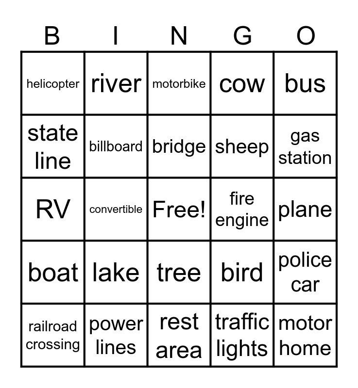 This bingo card has a free space and 36 words: ambulance, American flag, bike, billboard, bird, boat, bridge, bug, bus, church, convertible, cow, digger, fire engine, gas station, helicopter, horse, lake, motor home, motorbike, plane, police car, power lines, railroad crossing, rest area, river, RV, school, sheep, state line, tractor, traffic cone, traffic lights, tree, truck and windmill.