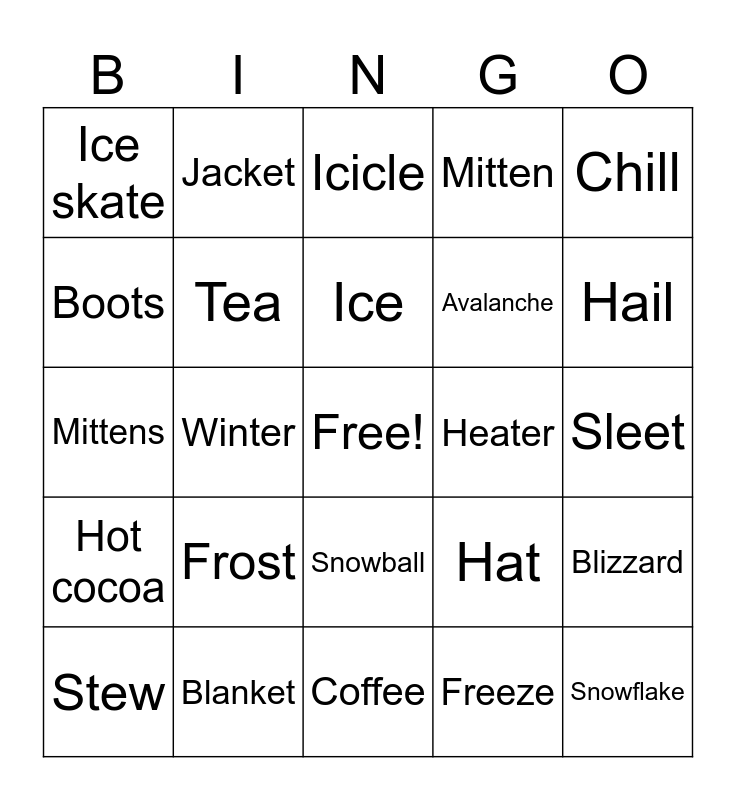 This bingo card has a free space and 42 words: Snow, Ice, Cold, Frost, Freeze, Blizzard, Snowflake, Snowstorm, Icicle, Snowball, Sleet, Hail, Winter, Chill, Scarf, Hat, Gloves, Mittens, Coat, Jacket, Boots, Snowboard, Ski, Ice skate, Snowman, Snowdrift, Avalanche, Glacier, Fir tree, Pinecone, Fireplace, Hot cocoa, Tea, Coffee, Soup, Stew, Blanket, Heater, Thermos, Fireplace, Mitten and Blizzard.