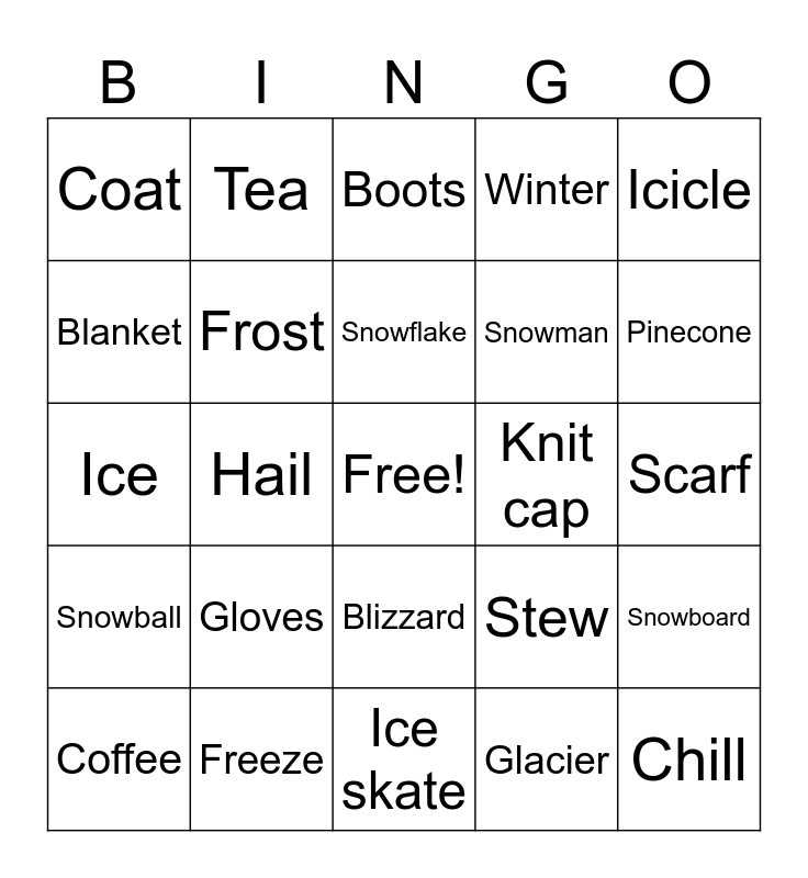 This bingo card has a free space and 41 words: Snow, Ice, Cold, Frost, Freeze, Blizzard, Snowflake, Snowstorm, Icicle, Snowball, Hail, Winter, Chill, Scarf, Knit cap, Gloves, Mittens, Coat, Jacket, Boots, Snowboard, Ski, Ice skate, Snowman, Snowdrift, Avalanche, Glacier, Fir tree, Pinecone, Fireplace, Hot cocoa, Tea, Coffee, Soup, Stew, Blanket, Heater, Thermos, Fireplace, Mitten and Igloo.