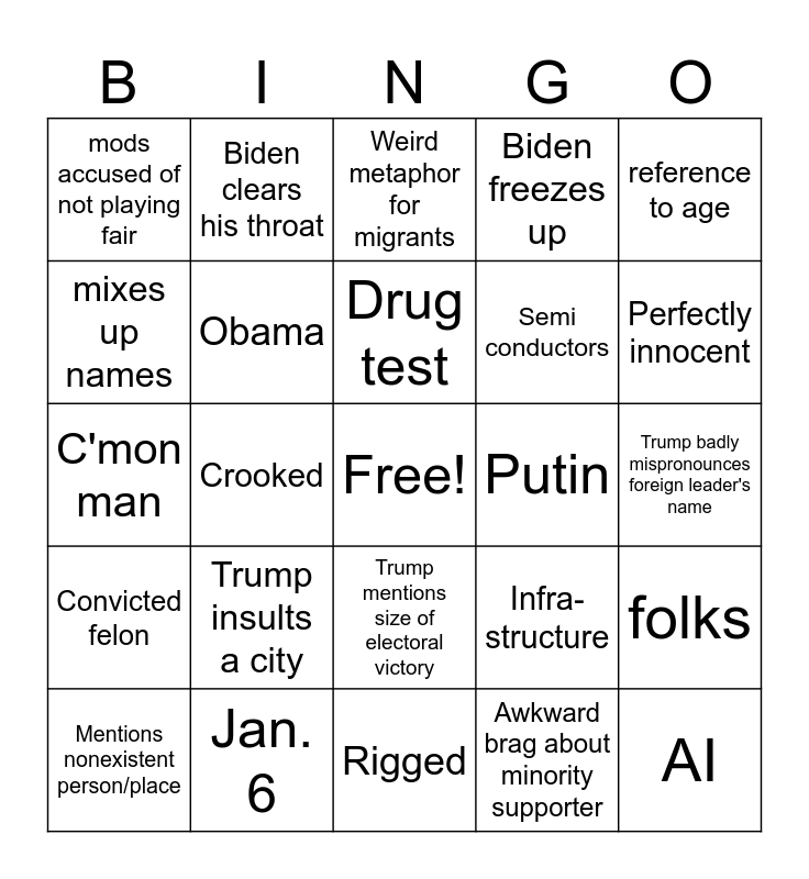 This bingo card has a free space and 24 words: Mentions nonexistent person/place, Trump insults a city, Drug test, Awkward brag about minority supporter, reference to age, mods accused of not playing fair, Biden clears his throat, Weird metaphor for migrants, Putin, Trump badly mispronounces foreign leader's name, C'mon man, Obama, Infra-structure, folks, mixes up names, Jan. 6, Rigged, Biden freezes up, Perfectly innocent, Convicted felon, Crooked, Trump mentions size of electoral victory, Semi conductors and AI.