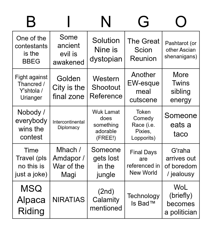 This bingo card has a free space and 24 words: Mhach / Amdapor / War of the Magi, NIRATIAS, Western Shootout Reference, MSQ Alpaca Riding, Pashtarot (or other Ascian shenanigans), One of the contestants is the BBEG, Fight against Thancred / Y'shtola / Urianger, Some ancient evil is awakened, Token Comedy Race (i.e. Pixies, Lopporits), Someone gets lost in the jungle, Another EW-esque meal cutscene, Nobody / everybody wins the contest, Final Days are referenced in New World, G'raha arrives out of boredom / jealousy, Golden City is the final zone, Technology Is Bad™, Someone eats a taco, Solution Nine is dystopian, More Twins sibling energy, Intercontinental Diplomacy, WoL (briefly) becomes a politician, Time Travel (pls no this is just a joke), The Great Scion Reunion and (2nd) Calamity mentioned.