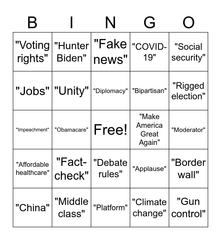 This bingo card has a free space and 61 words: "Build back better", "Middle class", "Infrastructure", "Affordable healthcare", "Climate change", "Economy", "Unity", "Working families", "Bipartisan", "Equity", "COVID-19", "Vaccines", "Jobs", "Clean energy", "Public schools", "Voting rights", "Gun control", "Social security", "Affordable housing", "Diplomacy", "Make America Great Again", "Fake news", "China", "Border wall", "Tax cuts", "Law and order", "Witch hunt", "Trade deals", "Rigged election", "Second Amendment", "Jobs", "Economy", "Military", "Strong borders", "Hunter Biden", "Radical left", "America First", "Obamacare", "Energy independence", "Impeachment", General Debate Phrases:, "Fact-check", "Moderator", "Interrupt", "Applause", "Rebuttal", "Polls", "Swing states", "Electoral college", "Debate rules", "Platform", "Campaign", "Fundraising", "Voting", "Ballot", "Turnout", "Pundit", "Media", "Town hall", "Live fact-checking" and "Closing statement".