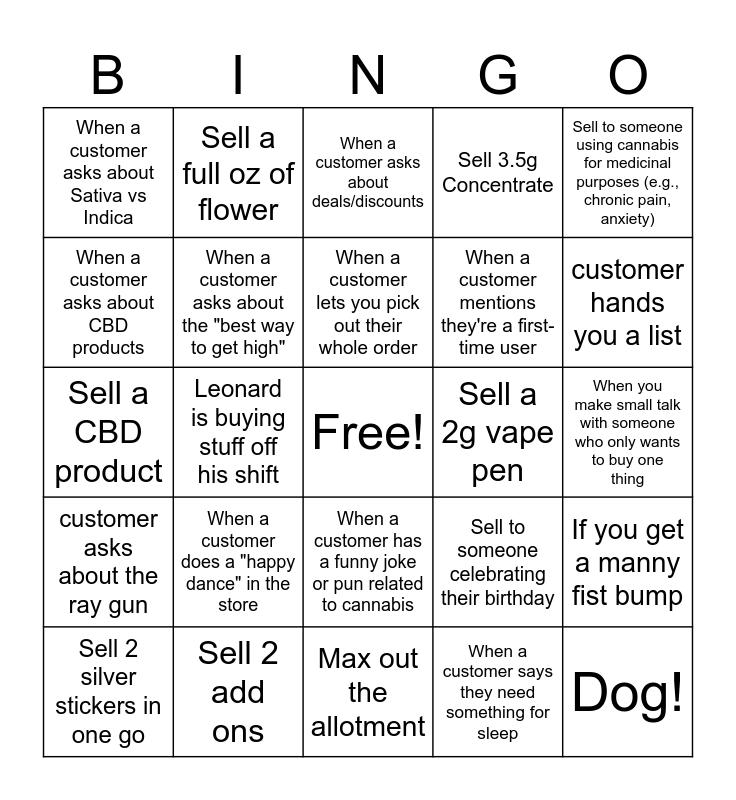 This bingo card has a free space and 28 words: If you get a manny fist bump, Customer says “i just made those this morning”, When a customer mentions they're a first-time user, When a customer says they need something for sleep, When a customer asks about CBD products, When a customer asks about deals/discounts, Sell a full oz of flower, customer asks about the ray gun, Sell a 2g vape pen, Sell 2 silver stickers in one go, Sell a CBD product, Sell 3.5g Concentrate, Sell 2 add ons, Max out the allotment, customer hands you a list, customer leaves something behind, When a customer does a "happy dance" in the store, When a customer asks about the "best way to get high", When a customer lets you pick out their whole order, When a customer has a funny joke or pun related to cannabis, When a customer asks about Sativa vs Indica, When a customer mentions they've been coming to your store for years, Dog!, Leonard is buying stuff off his shift, When you make small talk with someone who only wants to buy one thing, Sell to someone celebrating their birthday, Sell to someone using cannabis for medicinal purposes (e.g., chronic pain, anxiety) and Sell to someone who is treating their pet (Pet Drops).