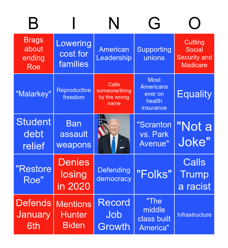 This bingo card has a free space and 24 words: Denies losing in 2020, Mentions Hunter Biden, Calls someone/thing by the wrong name, Defends January 6th, Cutting Social Security and Madicare, Brags about ending Roe, "Malarkey", Lowering cost for families, "Scranton vs. Park Avenue", Defending democracy, Most Americans ever on health insurance, Student debt relief, "Folks", Calls Trump a racist, Reproductive freedom, "The middle class built America", "Not a Joke", American Leadership, Equality, Ban assault weapons, Infrastructure, "Restore Roe", Supporting unions and Record Job Growth.