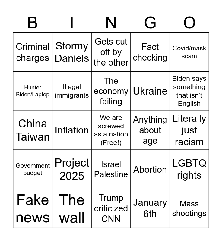 This bingo card has a free space and 24 words: Project 2025, The wall, The economy failing, Fake news, Covid/mask scam, Criminal charges, Hunter Biden/Laptop, Stormy Daniels, Anything about age, Israel Palestine, Ukraine, China Taiwan, Abortion, LGBTQ rights, Illegal immigrants, January 6th, Literally just racism, Gets cut off by the other, Biden says something that isn’t English, Inflation, Mass shootings, Government budget, Fact checking and Trump criticized CNN.