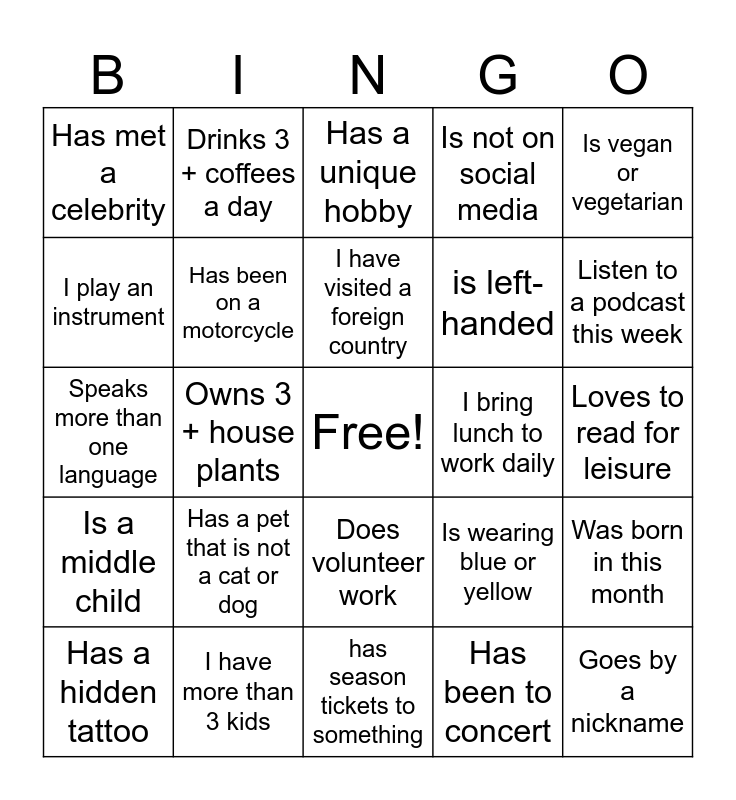 This bingo card has a free space and 24 words: Has a pet that is not a cat or dog, I have more than 3 kids, I have visited a foreign country, Has a hidden tattoo, Is vegan or vegetarian, Has met a celebrity, I play an instrument, Drinks 3 + coffees a day, I bring lunch to work daily, Does volunteer work, is left-handed, Speaks more than one language, Is wearing blue or yellow, Was born in this month, Has been on a motorcycle, Has been to concert, Loves to read for leisure, Has a unique hobby, Listen to a podcast this week, Owns 3 + house plants, Goes by a nickname, Is a middle child, Is not on social media and has season tickets to something.