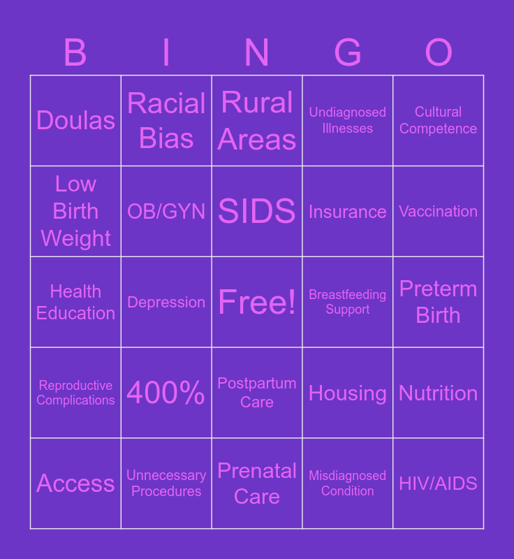 This bingo card has a free space and 25 words: 400%, Prenatal Care, SIDS, Access, Cultural Competence, Doulas, Low Birth Weight, Racial Bias, Breastfeeding Support, Postpartum Care, Insurance, Health Education, Housing, Nutrition, OB/GYN, Infant Mortality, Preterm Birth, Rural Areas, Vaccination, Depression, HIV/AIDS, Unnecessary Procedures, Reproductive Complications, Undiagnosed Illnesses and Misdiagnosed Condition.