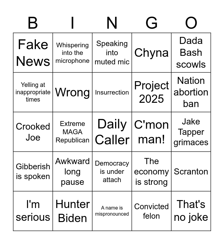 This bingo card has a free space and 24 words: Awkward long pause, Hunter Biden, Insurrection, I'm serious, Dada Bash scowls, Fake News, Yelling at inappropriate times, Whispering into the microphone, C'mon man!, Democracy is under attach, Project 2025, Crooked Joe, The economy is strong, Scranton, Wrong, Convicted felon, Jake Tapper grimaces, Speaking into muted mic, Nation abortion ban, Extreme MAGA Republican, That's no joke, Gibberish is spoken, Chyna and A name is mispronounced.