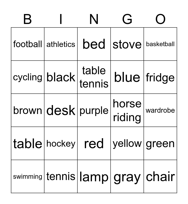 This bingo card has a free space and 24 words: hockey, tennis, table tennis, swimming, basketball, football, cycling, athletics, horse riding, red, blue, brown, yellow, green, black, gray, wardrobe, bed, fridge, desk, chair, table, stove and lamp.