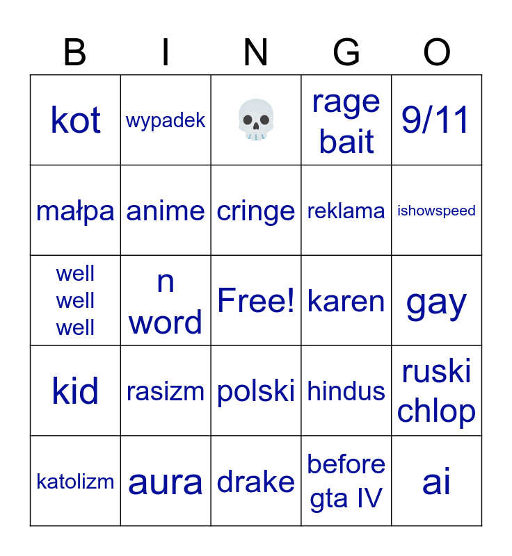 This bingo card has a free space and 24 words: rasizm, aura, cringe, katolizm, 9/11, kot, małpa, wypadek, karen, polski, reklama, well well well, hindus, ruski chlop, anime, before gta IV, gay, 💀, ishowspeed, n word, ai, kid, rage bait and drake.