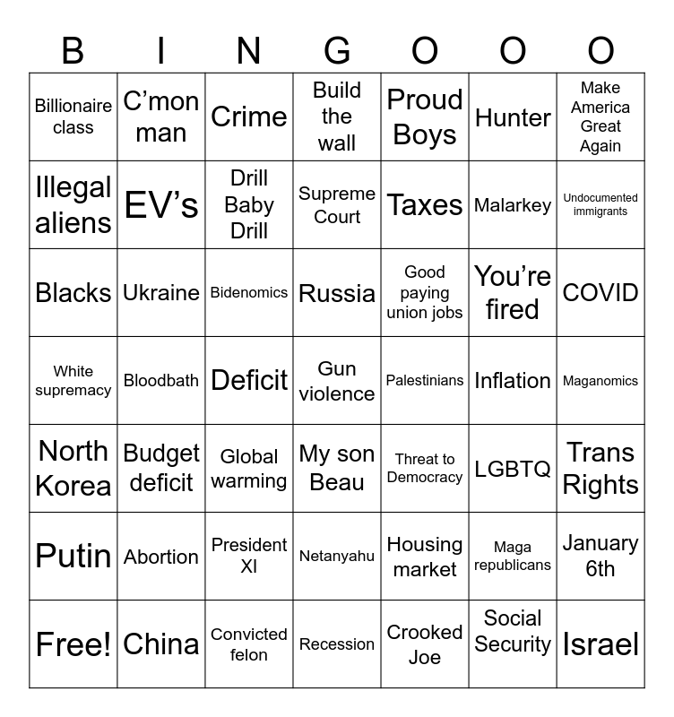 This bingo card has 49 words: Maga republicans, Malarkey, Crooked Joe, Bloodbath, Bidenomics, Maganomics, C’mon man, Convicted felon, Hunter, My son Beau, Make America Great Again, Build the wall, You’re fired, Good paying union jobs, Abortion, Inflation, Illegal aliens, Undocumented immigrants, January 6th, Proud Boys, Taxes, Deficit, Billionaire class, EV’s, Free!, Drill Baby Drill, COVID, China, Russia, Ukraine, Israel, Palestinians, Putin, President XI, White supremacy, Threat to Democracy, LGBTQ, Trans Rights, Blacks, Global warming, Netanyahu, North Korea, Gun violence, Recession, Supreme Court, Crime, Housing market, Budget deficit and Social Security.