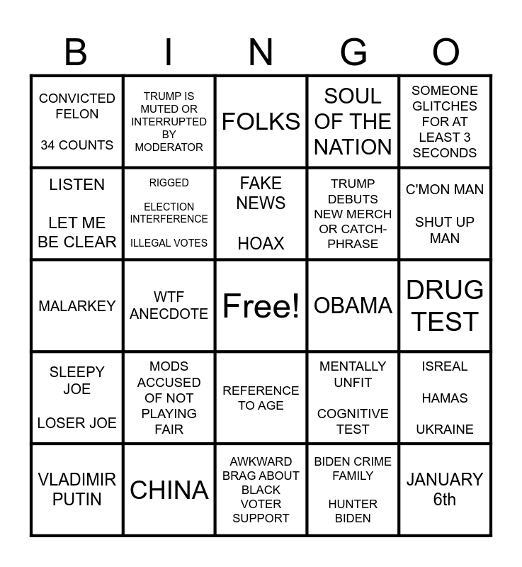 This bingo card has a free space and 29 words: VLADIMIR PUTIN, BORDER CRISIS, WTF ANECDOTE, SOMEONE TRIPS OR WANDERS OFF, CONVICTED FELON 34 COUNTS, FOLKS, RIGGED ELECTION INTERFERENCE ILLEGAL VOTES, MODS ACCUSED OF NOT PLAYING FAIR, OBAMA, CHINA, DRUG TEST, JANUARY 6th, AWKWARD BRAG ABOUT BLACK VOTER SUPPORT, BIDEN CRIME FAMILY HUNTER BIDEN, C'MON MAN SHUT UP MAN, CROOKED, REFERENCE TO AGE, SLEEPY JOE LOSER JOE, SOMEONE GLITCHES FOR AT LEAST 3 SECONDS, MALARKEY, MENTALLY UNFIT COGNITIVE TEST, WITCH HUNT UNFAIR TREATMENT, TRUMP DEBUTS NEW MERCH OR CATCH-PHRASE, LISTEN LET ME BE CLEAR, SOUL OF THE NATION, TRUMP IS MUTED OR INTERRUPTED BY MODERATOR, ISREAL HAMAS UKRAINE, FAKE NEWS HOAX and RADICAL LEFT RADICAL RIGHT.