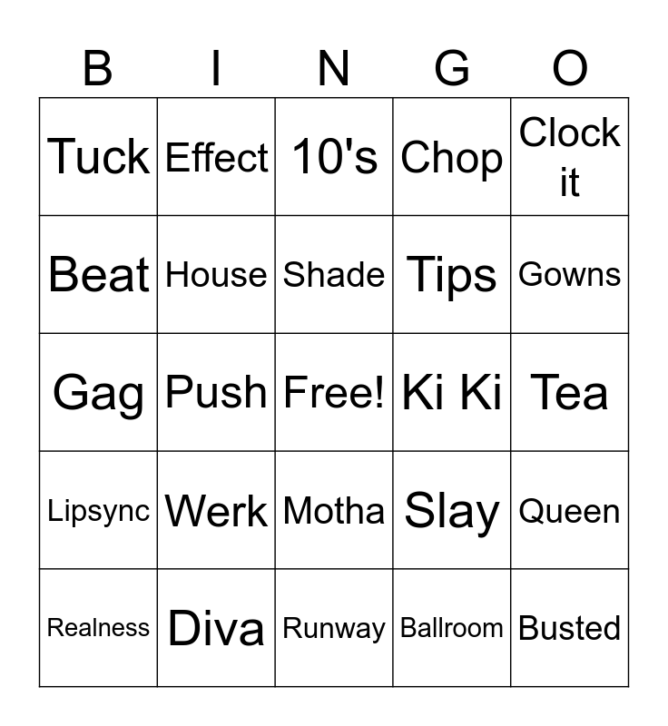 This bingo card has a free space and 24 words: Werk, Diva, Shade, Realness, Clock it, Tuck, Beat, Effect, Ki Ki, Motha, Tips, Gag, Slay, Queen, House, Ballroom, Tea, 10's, Gowns, Push, Busted, Lipsync, Chop and Runway.