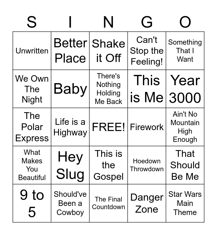 This bingo card has a free space and 34 words: Shower, Danger Zone, Party in the USA, Try Everything, What Makes You Beautiful, Baby, Something That I Want, 9 to 5, Better Place, Someday, There's Nothing Holding Me Back, Shake it Off, Little Boo Thang, Funkytown, Firework, Year 3000, Should've Been a Cowboy, The Polar Express, Hey Slug, Hoedown Throwdown, This is the Gospel, Hot Wings, Unwritten, Ain't No Mountain High Enough, The Final Countdown, Star Wars Main Theme, Can't Stop the Feeling!, Sh-Boom, This is Me, We Own The Night, Southern Nights, Life is a Highway, That Should Be Me and Can You Feel the Love Tonight?.