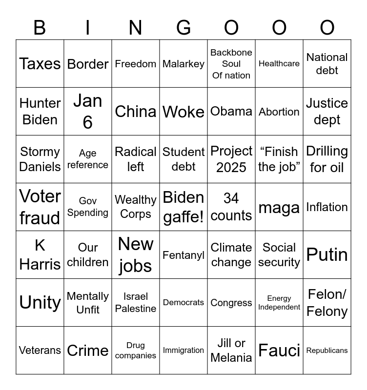 This bingo card has a free space and 48 words: Congress, Abortion, Immigration, Gov Spending, Radical left, Inflation, Border, Crime, Healthcare, Fentanyl, National debt, Malarkey, “Finish the job”, Project 2025, Unity, maga, Hunter Biden, Justice dept, Energy Independent, Backbone Soul Of nation, Obama, Wealthy Corps, Taxes, Jan 6, Felon/ Felony, China, Drilling for oil, Veterans, Student debt, Age reference, Fauci, 34 counts, Putin, Mentally Unfit, Voter fraud, Climate change, Social security, Stormy Daniels, New jobs, Israel Palestine, K Harris, Republicans, Freedom, Drug companies, Woke, Democrats, Our children and Jill or Melania.