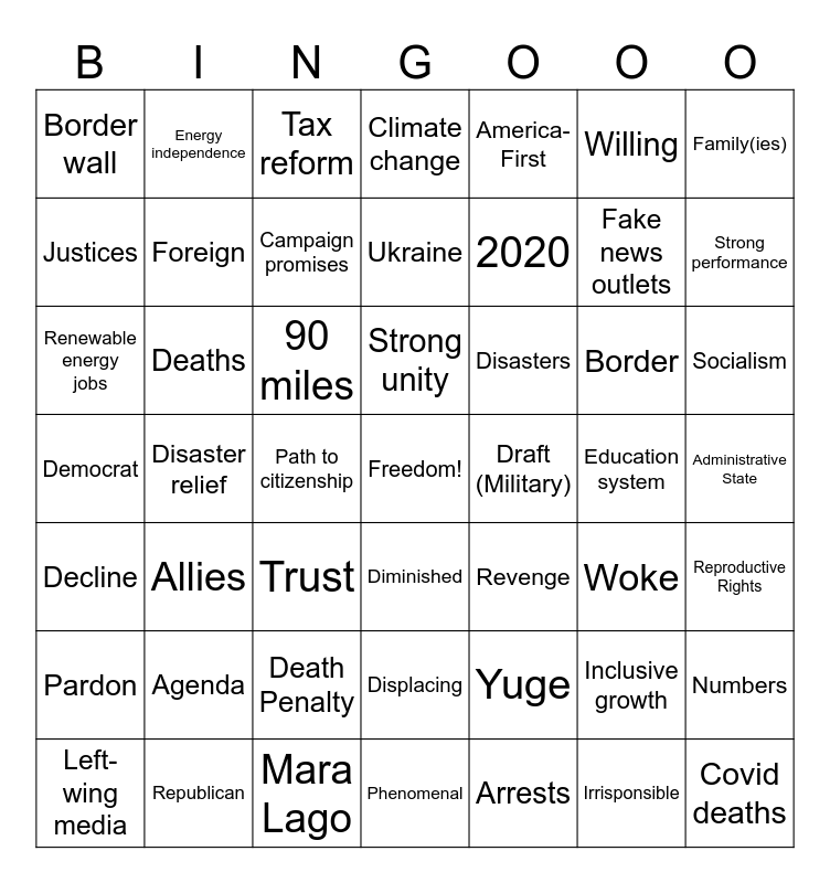 This bingo card has a free space and 48 words: Yuge, Fake news outlets, Phenomenal, Disaster relief, 90 miles, Administrative State, Energy independence, Republican, Willing, Diminished, Family(ies), Climate change, Border, Disasters, Pardon, Education system, Justices, Strong performance, Inclusive growth, America-First, 2020, Path to citizenship, Border wall, Foreign, Numbers, Campaign promises, Socialism, Left-wing media, Strong unity, Deaths, Irrisponsible, Draft (Military), Reproductive Rights, Agenda, Democrat, Revenge, Woke, Renewable energy jobs, Trust, Death Penalty, Decline, Covid deaths, Tax reform, Mara Lago, Ukraine, Displacing, Allies and Arrests.