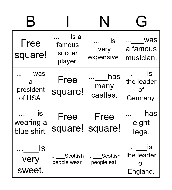 This bingo card has 16 words: ...___Scottish people wear., ...___has eight legs., ...___is very expensive., Free square!, ...___is wearing a blue shirt., ...___is a famous soccer player., Free square!, ...___Scottish people eat., ...___was a president of USA., Free square!, ...___is very sweet., ...___was a famous musician., Free square!, ...___is the leader of Germany., ...___has many castles. and ...___is the leader of England..