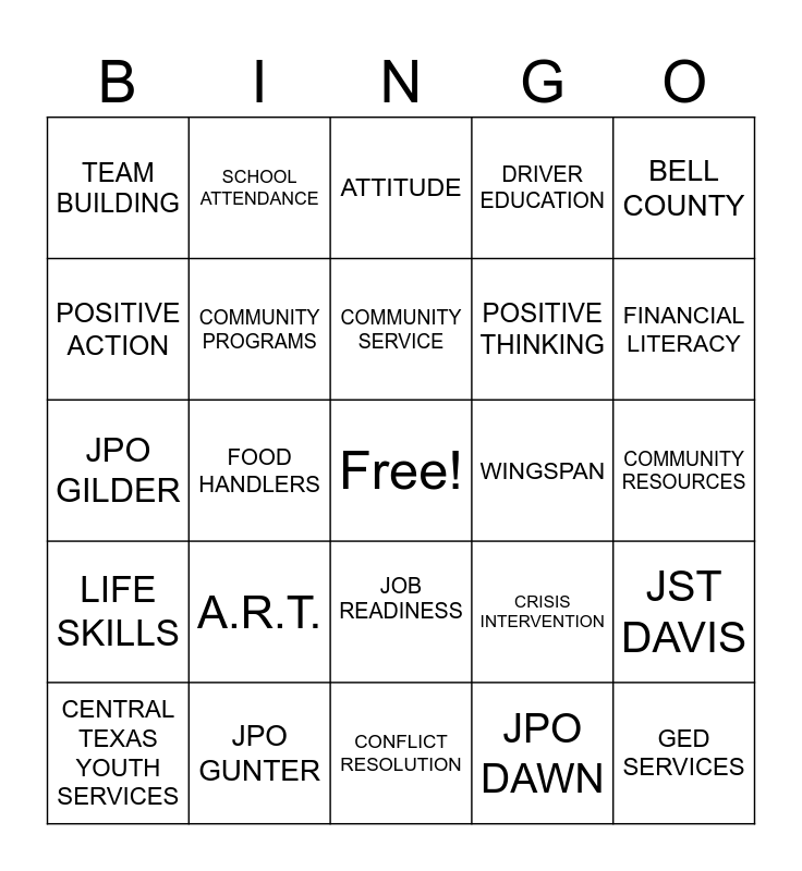 This bingo card has a free space and 39 words: STARRY, MCH, TEXAS WORKFORCE, COMMUNITY PROGRAMS, CENTRAL TEXAS YOUTH SERVICES, JOB READINESS, COMMUNITY SERVICE, JJAEP, BELL COUNTY, LIFE SKILLS, FOOD HANDLERS, DRIVER EDUCATION, GED SERVICES, COMMUNITY RESOURCES, WINGSPAN, A.R.T., RE-ENTRY, TEAM BUILDING, COMMUNICATION, CRISIS INTERVENTION, POSITIVE ACTION, CONFLICT RESOLUTION, POSITIVE THINKING, FINANCIAL LITERACY, COMMUNITY PROGRAMS SUPERVISOR LEON, GOALS, SUBSTANCE ABUSE, JPO DANN, POSITIVE PEERS, SCHOOL ATTENDANCE, YOUTH ENRICHMENT, FAMILY RELATIONSHIPS, ATTITUDE, JPO GUNTER, JPO DAWN, PROGRAM ADVISOR CHAVEZ, JST DAVIS, JPO GILDER and Ms. O.