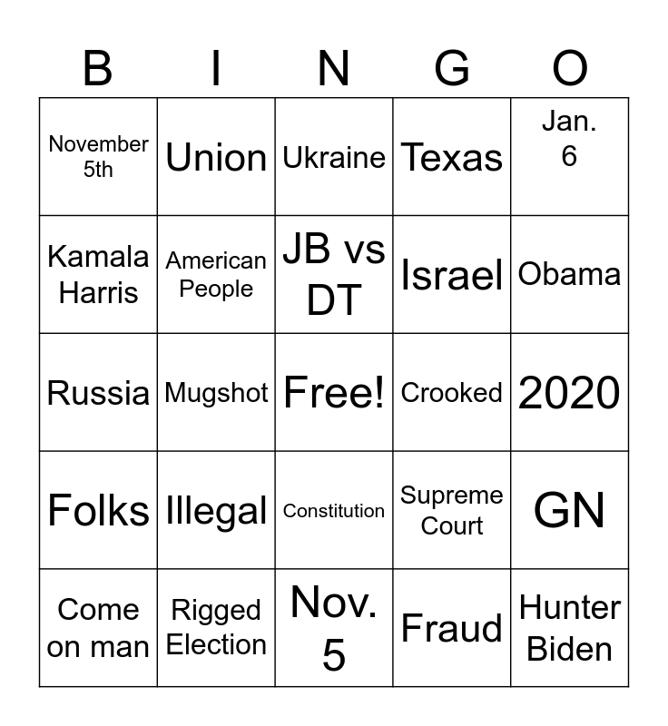 This bingo card has a free space and 29 words: Come on man, China, Mugshot, Bidenomics, November 5th, Ukraine, American People, Illegal, Crooked, Rigged Election, 2020, Hunter Biden, Nov. 5, Fraud, Obama, Border Crisis, Constitution, Folks, Jan. 6, Russia, Supreme Court, 4 years, Israel, Kamala Harris, Texas, Union, GN, JB vs DT and ?.