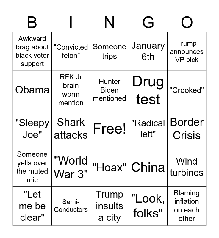 This bingo card has a free space and 32 words: "Look, folks", Someone farts, Shark attacks, "Fascist dictator", Someone yells over the muted mic, RFK Jr brain worm mention, Trump announces VP pick, Wind turbines, "Convicted felon", "34 counts", Hunter Biden mentioned, Someone trips, Tik Tok ban, "Witch hunt", "Radical left", Putin, "Let me be clear", "Sleepy Joe", "Hoax", "World War 3", China, "Rigged", Border Crisis, Semi-Conductors, Blaming inflation on each other, January 6th, Drug test, Obama, Awkward brag about black voter support, Trump insults a city, Reference to age and "Crooked".