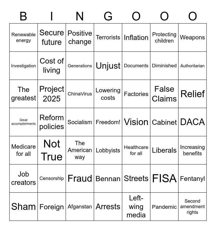 This bingo card has a free space and 48 words: Streets, Diminished, Arrests, Reform policies, ChinaVirus, DACA, Secure future, Foreign, Protecting children, Lobbyists, Weapons, Terrorists, False Claims, Factories, Job creators, Cabinet, Investigation, Authoritarian, FISA, Inflation, Documents, Socialism, Renewable energy, Cost of living, Fentanyl, Generations, Relief, Sham, Lowering costs, Project 2025, Pandemic, Vision, Increasing benefits, Censorship, Great accomplishments, Healthcare for all, Liberals, The greatest, The American way, Fraud, Medicare for all, Second amendment rights, Positive change, Afganstan, Unjust, Bennan, Not True and Left-wing media.