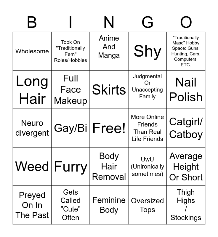 This bingo card has a free space and 24 words: Furry, Gets Called "Cute" Often, Skirts, Preyed On In The Past, "Traditionally Masc" Hobby Space: Guns, Hunting, Cars, Computers, ETC., Wholesome, Long Hair, Took On "Traditionally Fem" Roles/Hobbies, More Online Friends Than Real Life Friends, Body Hair Removal, Judgmental Or Unaccepting Family, Neuro divergent, UwU (Unironically sometimes), Average Height Or Short, Full Face Makeup, Oversized Tops, Catgirl/ Catboy, Anime And Manga, Nail Polish, Gay/Bi, Thigh Highs / Stockings, Weed, Shy and Feminine Body.