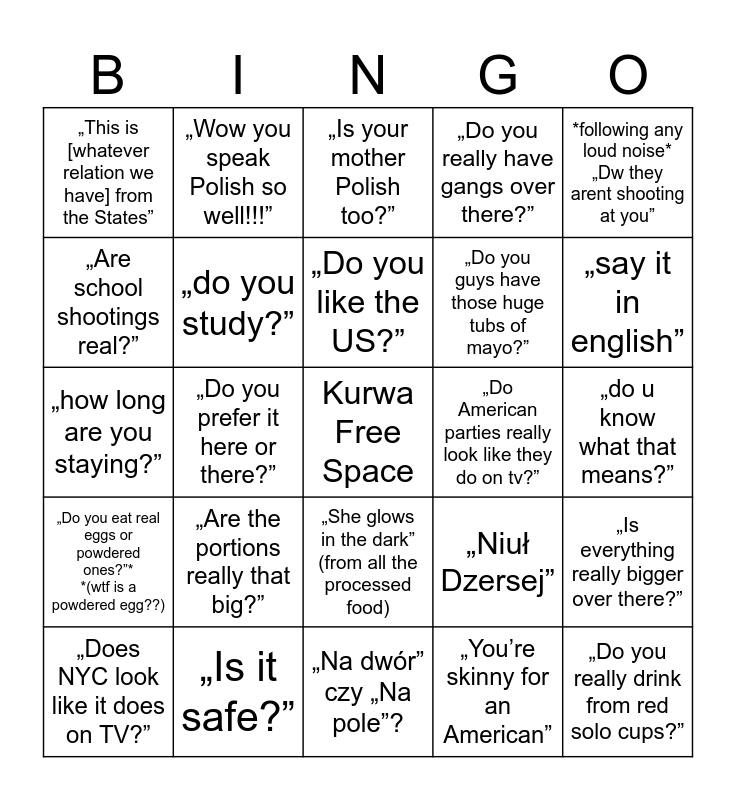 This bingo card has a free space and 24 words: „Are the portions really that big?”, „Is it safe?”, „Do you like the US?”, „Does NYC look like it does on TV?”, *following any loud noise* „Dw they arent shooting at you”, „This is [whatever relation we have] from the States”, „Are school shootings real?”, „Wow you speak Polish so well!!!”, „Do American parties really look like they do on tv?”, „She glows in the dark” (from all the processed food), „Do you guys have those huge tubs of mayo?”, „how long are you staying?”, „Niuł Dzersej”, „Is everything really bigger over there?”, „do you study?”, „You’re skinny for an American”, „do u know what that means?”, „Is your mother Polish too?”, „say it in english”, „Do you prefer it here or there?”, „Do you really drink from red solo cups?”, „Do you eat real eggs or powdered ones?”* *(wtf is a powdered egg??), „Do you really have gangs over there?” and „Na dwór” czy „Na pole”?.