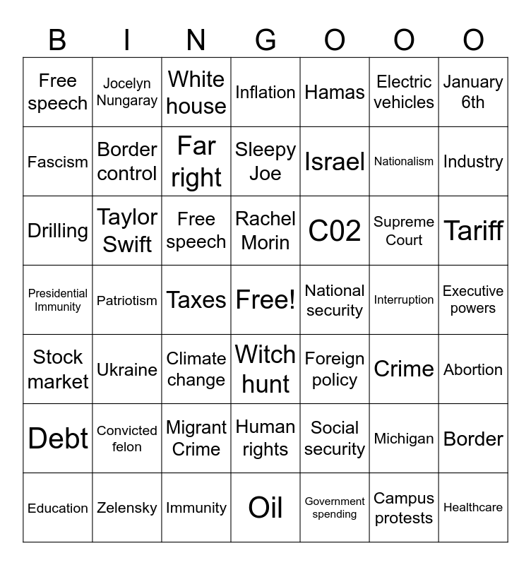 This bingo card has a free space and 57 words: Hostages, Tariff, Immigration, Free speech, Patriotism, Human rights, January 6th, Law, Border control, Social security, Inflation, Debt, Stock market, Executive powers, Immunity, Ukraine, Hamas, Israel, China, Nationalism, Industry, Climate change, C02, White house, Election interference, Fascism, Interruption, Age, Far right, Witch hunt, Putin, Abortion, Zelensky, Oil, Drilling, Electric vehicles, Convicted felon, Sleepy Joe, Migrant Crime, Taylor Swift, Jocelyn Nungaray, Rachel Morin, Healthcare, Jobs, Border, Education, Free speech, Presidential Immunity, Government spending, Crime, National security, Taxes, Foreign policy, Michigan, Campus protests, Supreme Court and Tips.