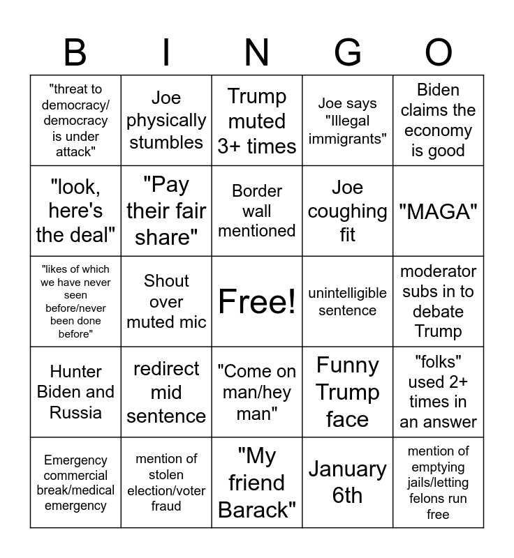This bingo card has a free space and 34 words: Ice cream (chocolate chocolate chip), January 6th, 34 (ish) counts, Poo-tin, Hunter Biden and Russia, "Pay their fair share", Biden claims the economy is good, Emergency commercial break/medical emergency, Joe physically stumbles, Misc. Biden story, Border wall mentioned, Trump muted 3+ times, "Crooked Joe", Reading notes word for word, unintelligible sentence, "MAGA", mention of stolen election/voter fraud, "likes of which we have never seen before/never been done before", redirect mid sentence, Funny Trump face, "Come on man/hey man", Chy-nah, "threat to democracy/ democracy is under attack", moderator subs in to debate Trump, "My friend Barack", mention of emptying jails/letting felons run free, Joe says "Illegal immigrants", "people / everyone is/are saying ... ", Joe coughing fit, "look, here's the deal", Ohio gets a shoutout, Shout over muted mic, "folks" used 2+ times in an answer and white knuckling podium.